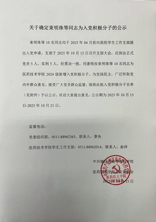 关于确定束明珠等同志为入党积极分子的公示