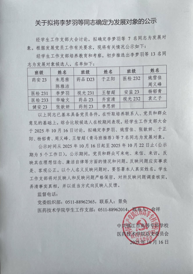 关于拟将李梦羽等同志确定为发展对象的公示